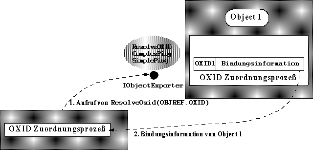 Jeden Server, der Objekte nach außen zur Verfügung stellt, bezeichnet DCOM als Objektexporteur. Folgt der Programmierer dem sogenannten Apartment-Modell für Multithreading, so kann ein DCOM-Objekt dabei nur in einem Thread ablaufen. Bei Verwendung des "Free Threading"-Modells darf die Verarbeitung eines DCOM-Objekts sich auch über mehrere Threads erstrecken. Falls sich ein Server als Objektexporteur betätigt, ordnet ihm das Laufzeitsystem als eindeutigen Identifikator den sogenannten OXID (Object Exporter Identifier) zu. Um auf ein Server-Objekt zuzugreifen, muß ein Client den jeweiligen OXID des für das Objekt verantwortlichen Objektexporteurs spezifizieren. Auf jeder Maschine mit installiertem DCOM-Laufzeitsystem ist ein sogenannter OXID-Zuordungsprozeß damit beauftragt, die entsprechenden Abbildungen von OXIDs auf die eigentliche Bindungsinformation durchzuführen (siehe Abb. OXID-Prozess).