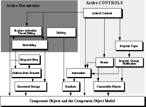 <Abb. ActiveX-Schnittstellen>: Alle ActiveX-Technologien basieren auf COM und bestehen aus Sammlungen von COM-Schnittstellen. Beispielsweise sind ActiveX-Dokumente Ÿber Schnittstellen für Embedding, Linking und Am-Ort-Aktivierung (engl. In-place Activation) definiert.