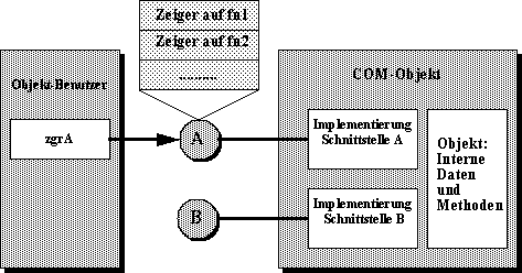 <Abb COM-Schnittstellen>: In COM ist der Zugriff auf Funktionalität eines Server-Objekts nur über Schnittstellen mšglich. Ein Benutzer greift dabei über Schnittstellenzeiger zu, die auf eine Tabelle von Methodenzeigern verweisen. Das physikalische Layout dieser virtuellen Tabelle schreibt Microsoft fest vor.