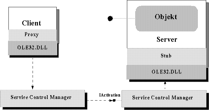 Möchte ein Client ein entferntes Objekt instanziieren, muß sich in der lokalen Registratur unter dem entsprechenden Identifikator (CLSID) ein Eintrag befinden, der den Netzwerkknoten des Zielobjekts bezeichnet. Das Laufzeitsystem des Clients und des Zielobjekts arbeiten in diesem Fall zusammen, um die gewünschte Verbindung herzustellen. Die Aktivierung des Zielobjekts erfolgt unter Kooperation der jeweiligen Service Control Manager. Hierbei handelt es sich um Systemprozesse, die bei API-Aufrufen wie zum Beispiel CoCreateInstance dazu dienen, um die Windows-Registry nach dem gewünschten Objekt zu durchsuchen, dieses gegebenfalls zu aktivieren und den entsprechenden Schnittstellenzeiger an den Aufrufer zurückzuliefern (siehe Abb : SCM).